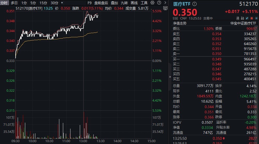 ETF盘中资讯|继续上攻!医疗ETF(512170)飙涨5%!AI医疗大爆发,迪安诊断20CM涨停!CXO同步冲高,药明康德涨超5%