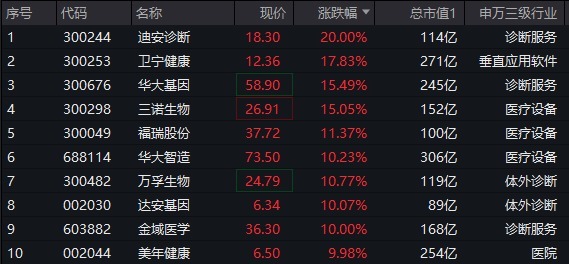 成份股方面,AI医疗、CXO联袂拉涨!迪安诊断20CM涨停,三诺生物、卫宁健康、华大智造等6股涨超10%,达安基因、美年健康、金域医学等3股涨停,CXO龙头股药明康德、康龙化成大涨超5%,泰格医药涨超7%。